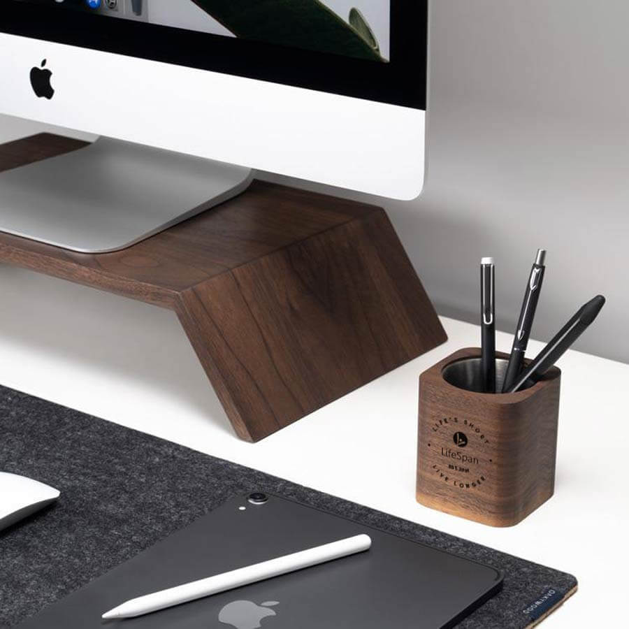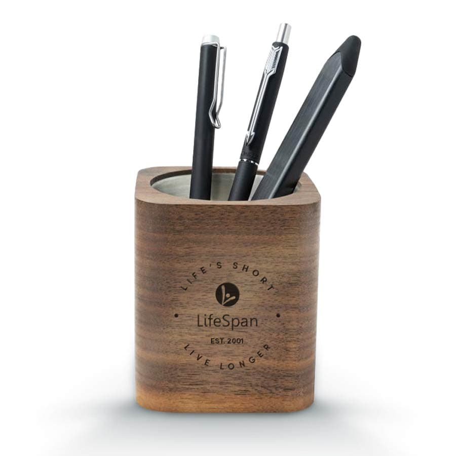 Made of solid oak or American walnut, the square wooden pencil cup is a unique accessory for your desk. The cup for pens has an aluminum insert and is resistant to damage and dirt. It is stylish and functional making it the perfect place to store small office supplies or even succulents.